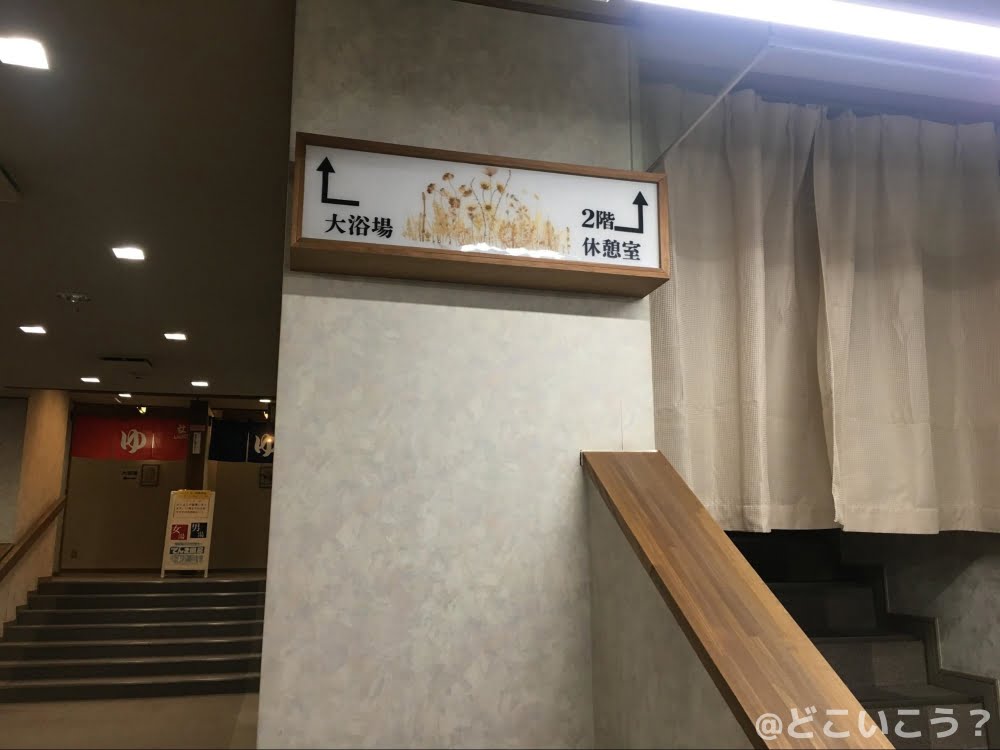 中へ進んでいくと右側に二階の休憩室への階段があり、左側に浴室の入り口があります。