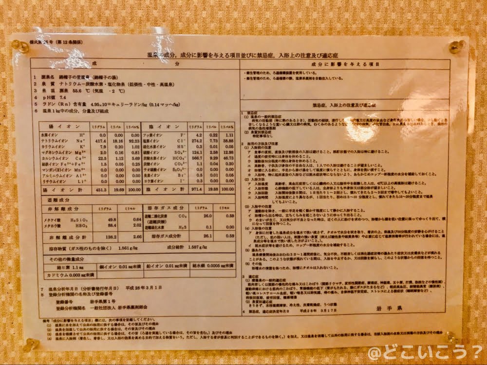 成分表はこんなかんじです。たまにこうして張り出されてない温泉もありますが、こういうふうに張り出してくれると安心できますよね。